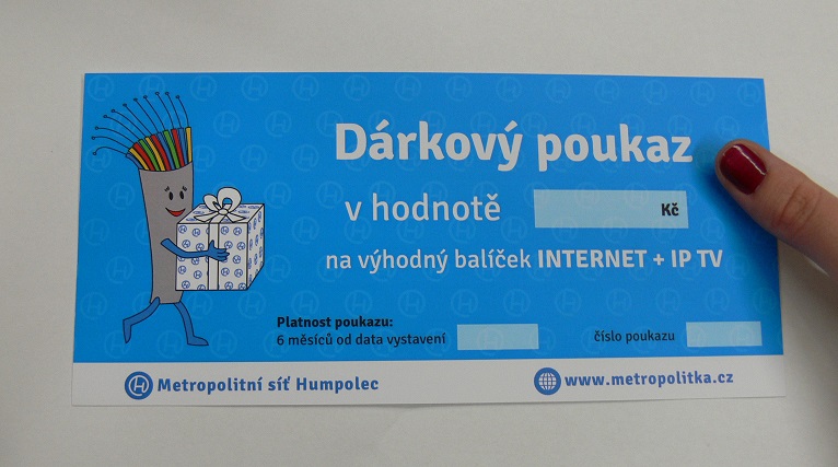 V nabídce máme samozřejmě i poukazy na naše služby a to na INTERNET i IPTV – můžete tak svým blízkým ušetřit nějakou tu korunu a služby jim předplatit klidně na celý rok!