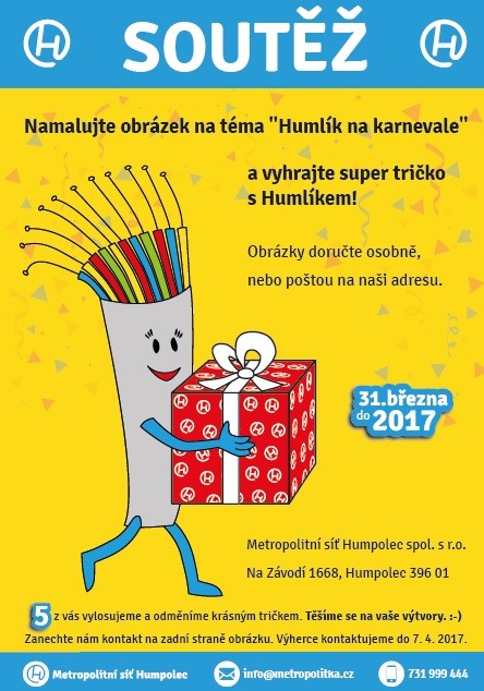 Dětské karnevaly jsou v plném proudu a Humlík na nich nesmí chybět. Do jakého kostýmu by se mohl převléknout? Už jste viděli Humlíka tančit a skotačit? Milé děti, namalujte nám, jak si Humlíka na karnevale představujtete právě vy, poproste dospěláky, ať vám pomůžou doručit obrázek na naši adresu a pak už jen očekávejte, zda budete mezi pěti vylosovanými výherci. Pro pět šikovných malířů máme připravená super trička s Humlíkem.